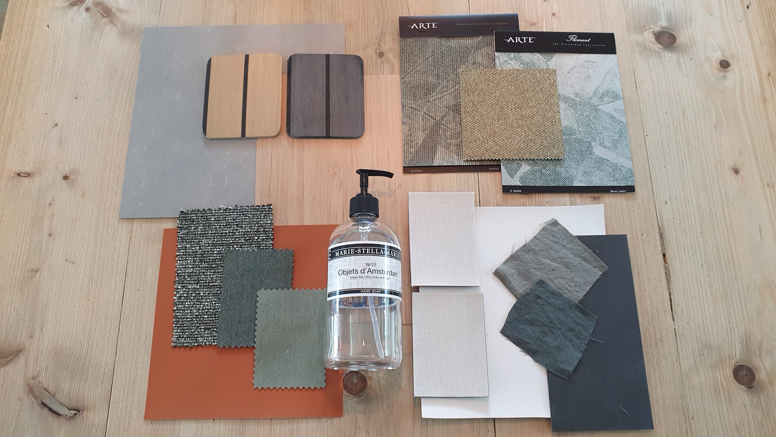 Alles is met elkaar in balans, zowel voor het slaapgedeelte als voor de keuken en de badkamer. Stoffering voor de bank, wand- en vloerbekleding, inclusief samples die ze allemaal heeft opgevraagd. Kleuren, texturen en materialen: het klopt allemaal en je ziet meteen hoe het gaat worden.